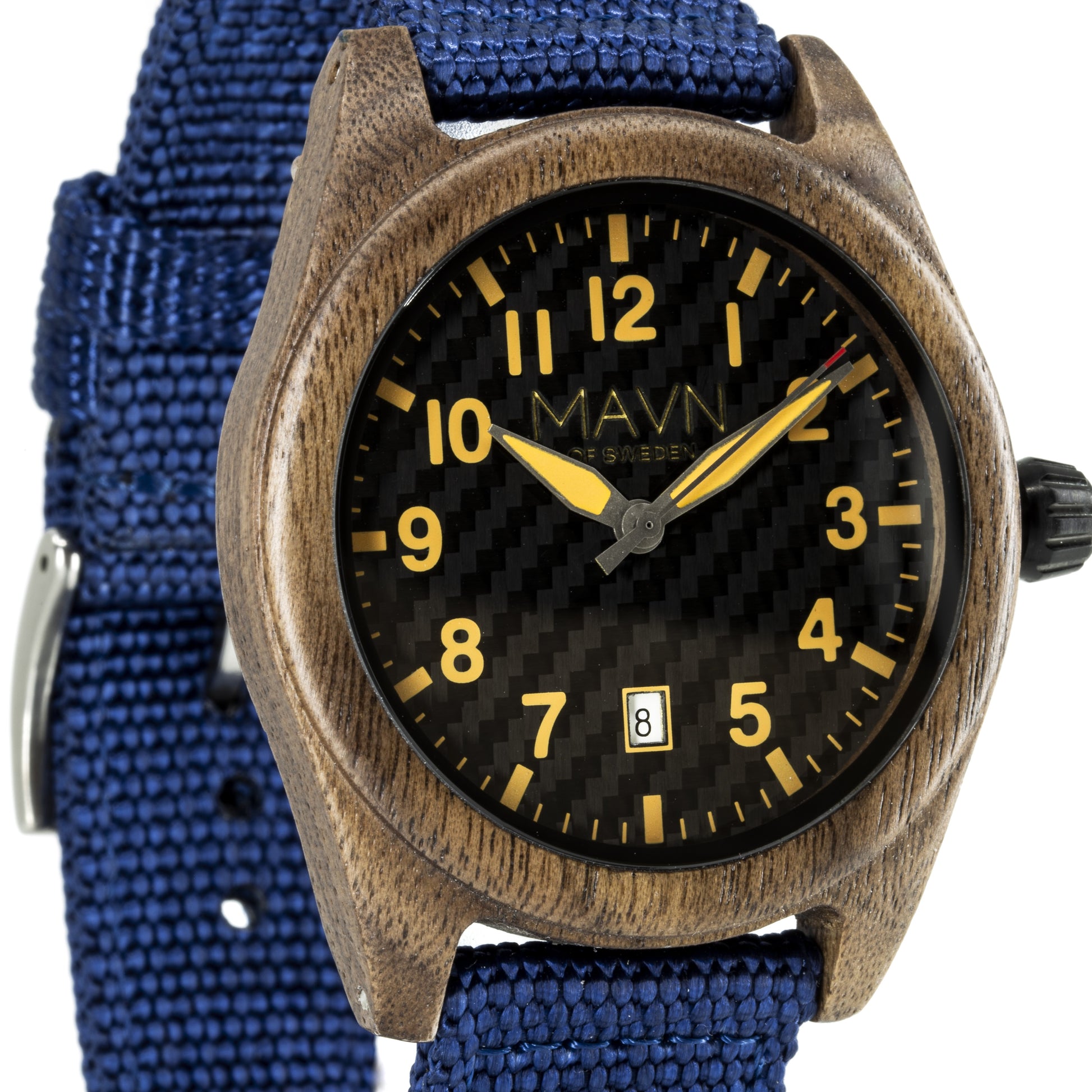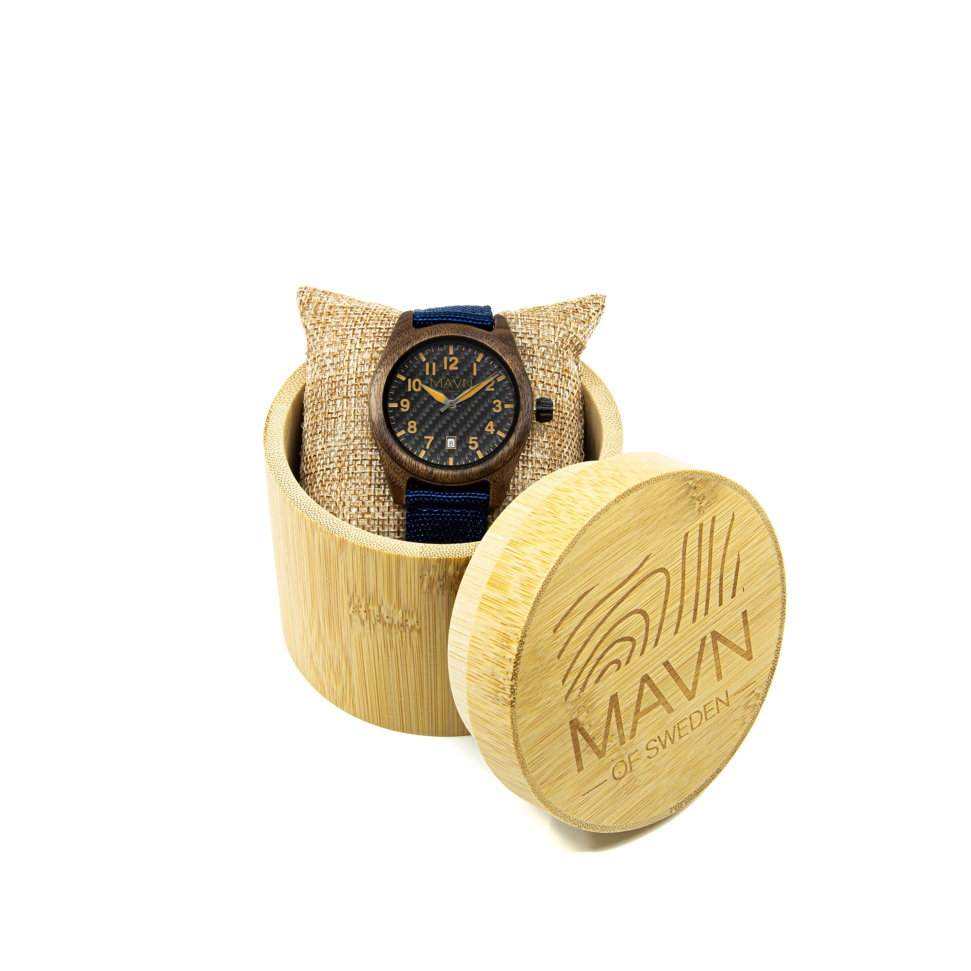 En herrklocka som kombinerar naturlig elegans med modern funktion. Boetten i valnötsträ ger varje klocka ett unikt uttryck, medan den svarta urtavlan med orange detaljer förstärker den sportigt eleganta känslan.